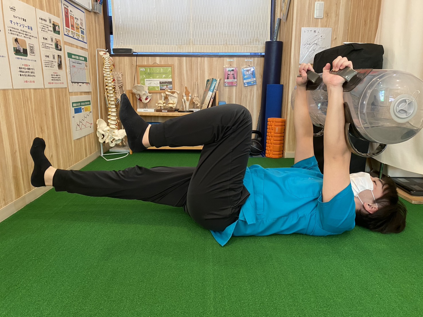 画像の様に仰向けに寝て、両手に持つ事で肩甲骨周りの安定性の向上と水を動かさない様に足を動かす事で体幹の筋肉を鍛えられます!