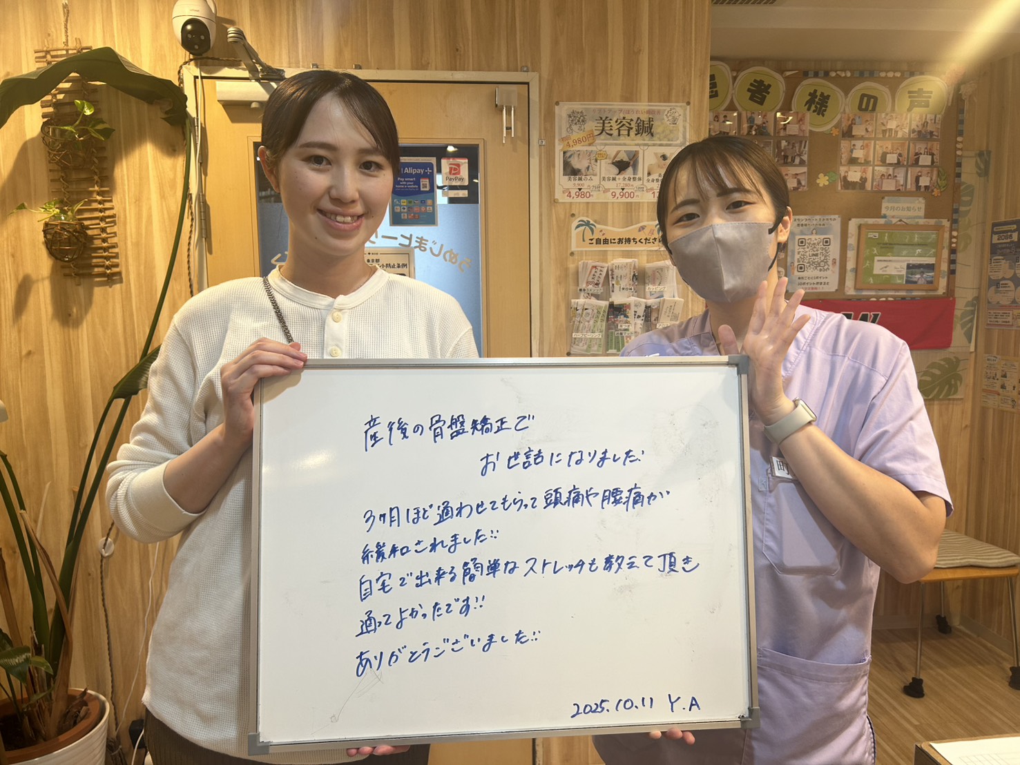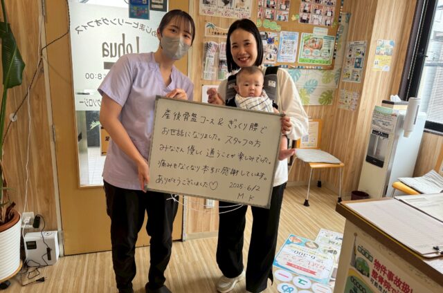 産後骨盤矯正に通われた方からは「3ヶ月ほど通わせてもらって、頭痛や腰痛が緩和されました!自宅で出来る簡単なストレッチも教えて頂き通ってよかったです!」とのお声をいただいています!
