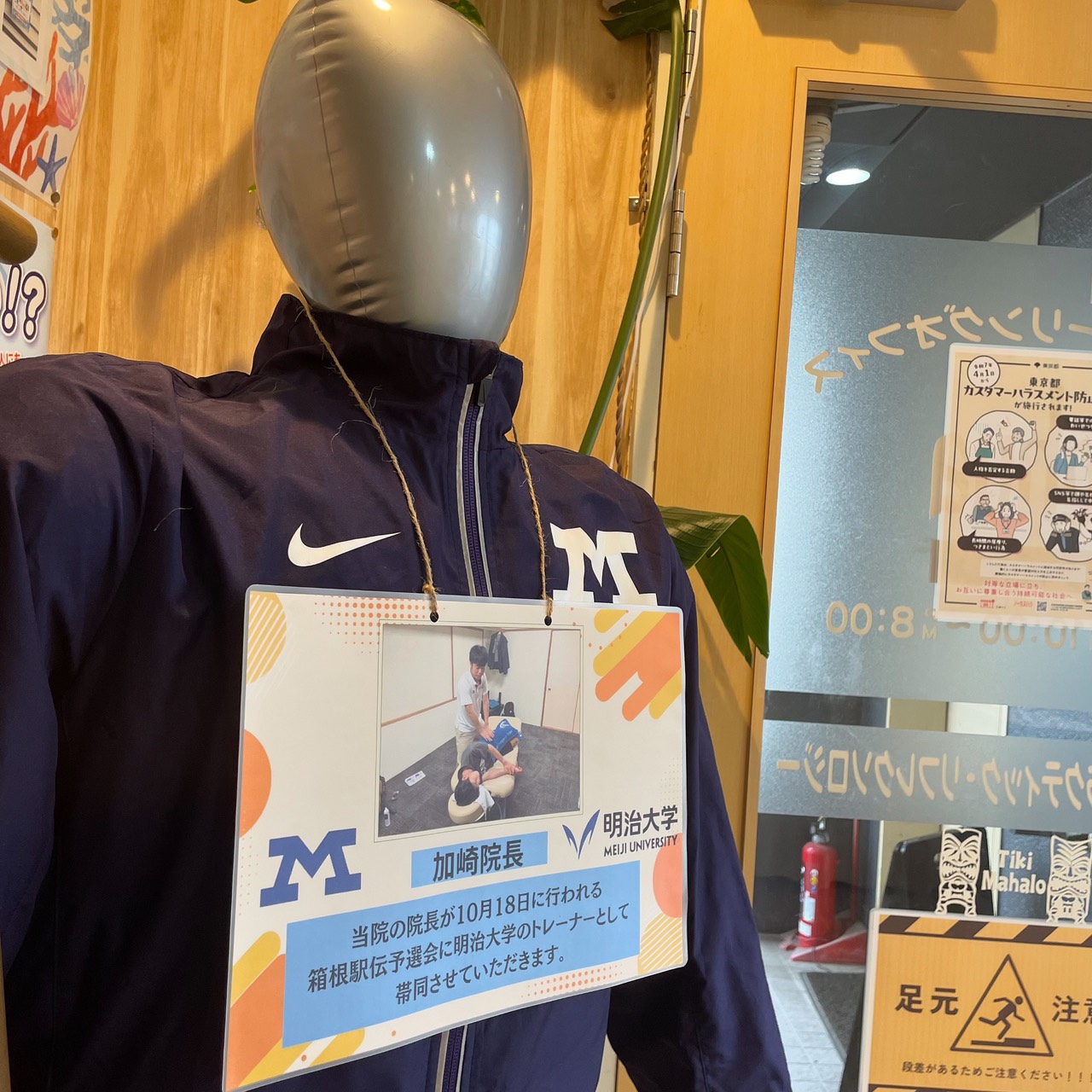 本日より、受付のマネキンが明治大学体育会競走部の公式ジャージにお着替えしております!