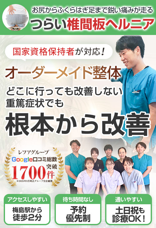 椎間板ヘルニアの施術は、レフアうめじま整骨院が得意とする施術の一つです。